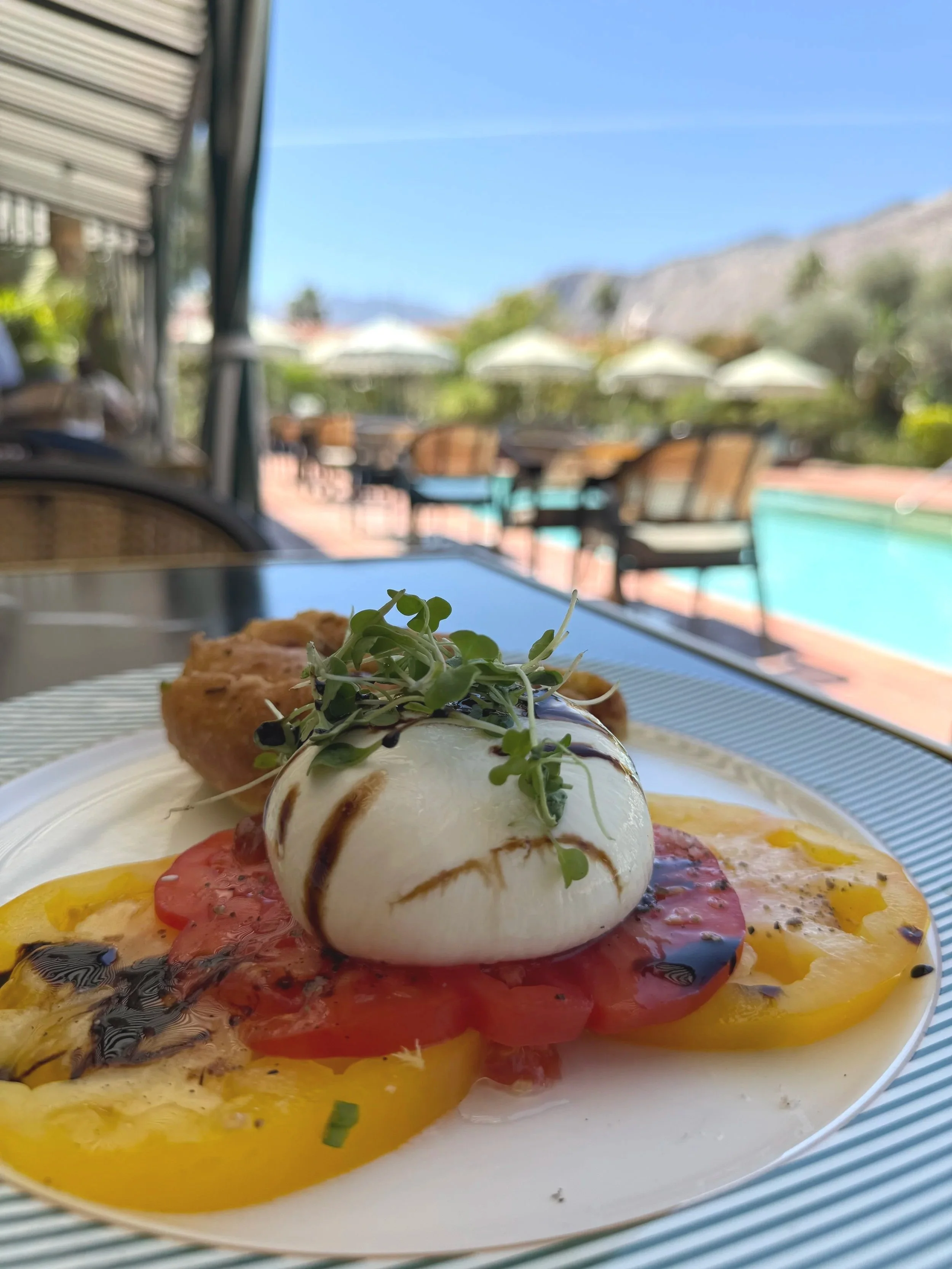 The burrata arrives simply—heirloom tomatoes, a clean finish, nothing unnecessary. It’s the kind of dish that works because of where you are, not in spite of it.