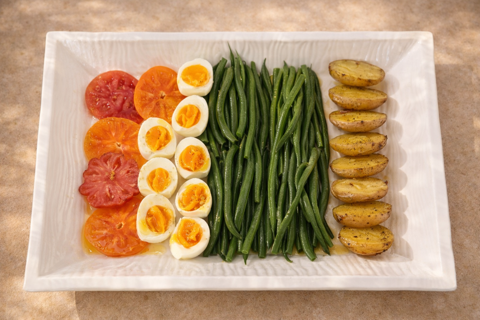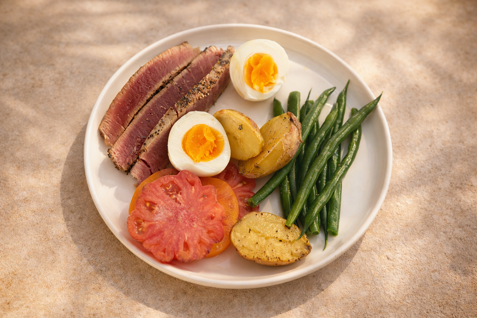 Bring a pot of water to a gentle boil while allowing the eggs to come to room temperature for 10–15 minutes to prevent cracking. Carefully lower the eggs into the water using a spoon and cook for 6½ to 7 minutes, depending on how soft you prefer the center. Immediately transfer the eggs to an ice bath and let them cool for 5–10 minutes to stop the cooking process. Once cooled, peel under running water, starting from the wider end where the air pocket sits. Slice just before serving to reveal a set white with a soft, custardy yolk—perfect for a Niçoise, where the egg becomes part of the dressing itself.