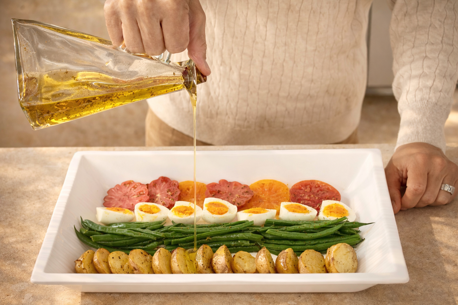 Arrange on a platter in rows - potatoes, ahi tuna, sliced tomatoes, green beans and optional black olives. Serve with the dressing on the side.