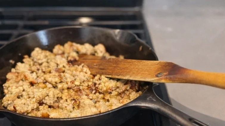 Fold in whipped cream cheese, cooked “cooled” sausage, green onions, and cubed provolone