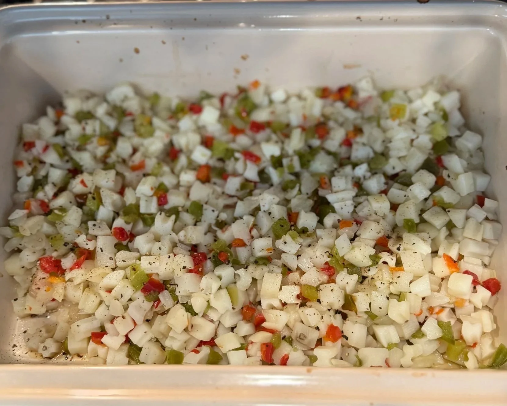 Crisp the hashbrowns and peppers in a light drizzle of olive oil, seasoned with salt and pepper, at 375° for about 30 minutes